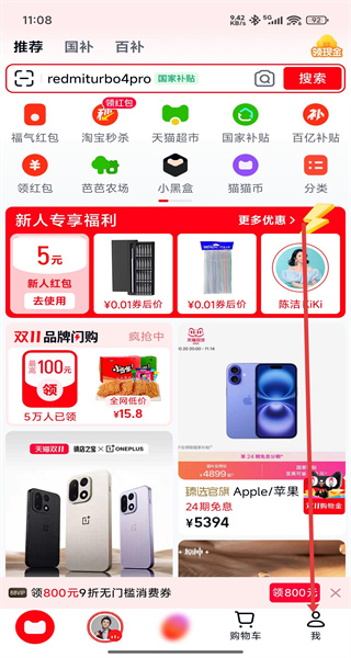 1、在天貓首頁中,可以點擊底部我按鈕,進入個人主頁中。
