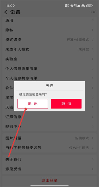 4、在彈窗中,點擊退出按鈕,即可完成退出天貓賬號操作。