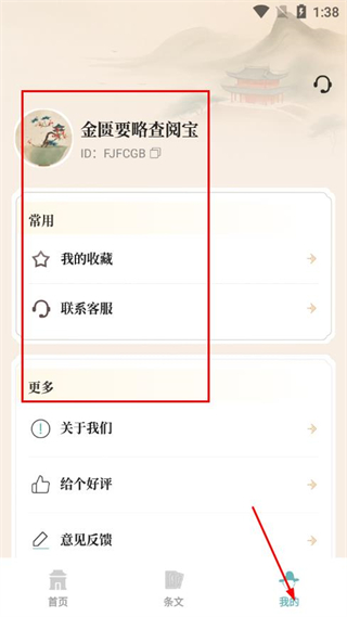 3、進入我的頁面,可查看我的收藏,管理收藏的經(jīng)方或條文,還能聯(lián)系客服、意見反饋,了解關(guān)于我們等信息。
