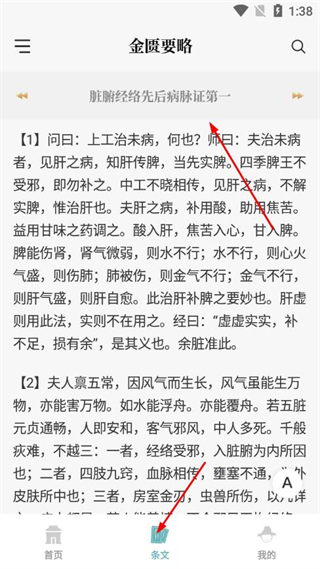 2、點擊條文選項,可查看金匱要略的具體條文內(nèi)容,如臟腑經(jīng)絡(luò)先后病脈證第一等篇章,助力用戶深入學(xué)習(xí)經(jīng)典條文。