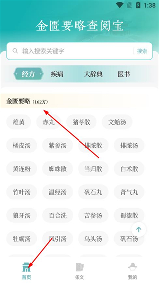 1、在首頁經(jīng)方標簽下,可查看金匱要略包含的162方,如雄黃、赤丸、豬苓散等方劑,方便用戶查詢經(jīng)方信息。