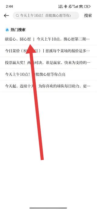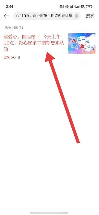 2、在搜索界面熱門搜索列表中,通過點擊獻愛心、圓心愿條目,跳轉至該新聞的詳細內容頁面。