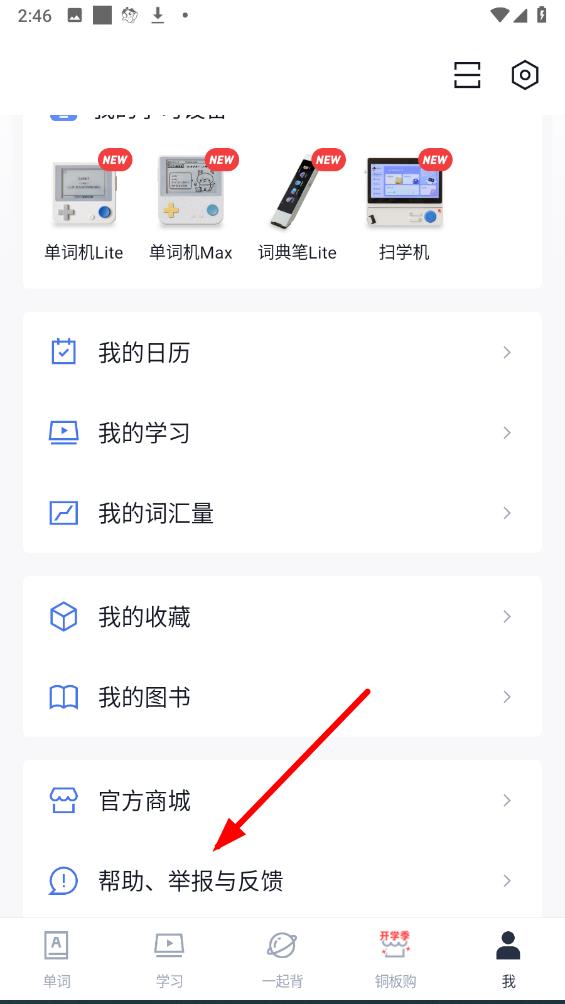 2、進入我的頁面后,向下滑動屏幕,找到幫助、舉報與反饋選項并點擊,即可進入幫助反饋相關界面。