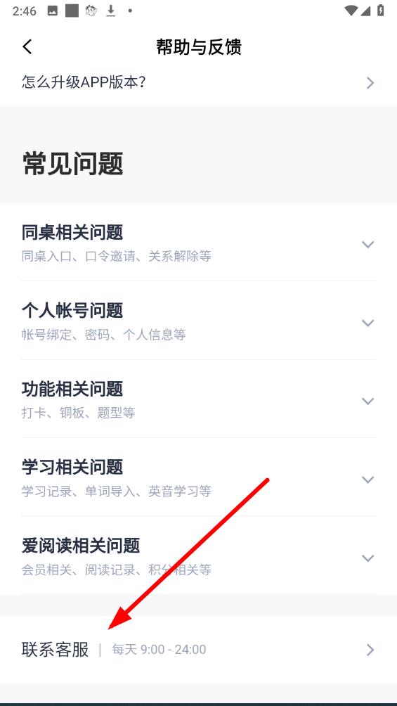 3、在幫助與反饋頁面中,繼續(xù)向下滑動找到聯(lián)系客服選項,可以看到客服服務時間,點擊該選項就能與百詞斬客服取得聯(lián)系。