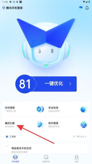 1、打開APP,在主界面點(diǎn)擊騷擾攔截的選項(xiàng),根據(jù)箭頭所指向的區(qū)域,點(diǎn)擊即可跳轉(zhuǎn)下一關(guān)頁(yè)面。