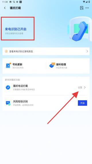 3、授權(quán)后,界面顯示來(lái)電識(shí)別已開啟,可進(jìn)一步操作:點(diǎn)擊騷擾電話攔截右側(cè)的設(shè)置。