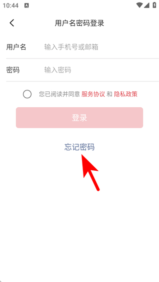 2、在用戶名密碼登錄的頁面,點(diǎn)擊忘記密碼的按鈕。