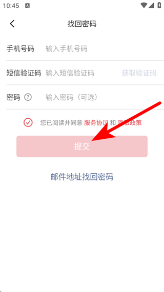 3、進(jìn)入頁面輸入手機(jī)號碼等信息后,點(diǎn)擊提交完成找回。