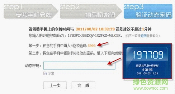 4、輸入QQ安全中心(手機(jī)令牌)上提示的24位初始碼到網(wǎng)頁提示位置,并點(diǎn)擊【下一步】。輸入網(wǎng)頁返回的4位校驗(yàn)碼到手機(jī),并點(diǎn)擊【校準(zhǔn)時(shí)間】。