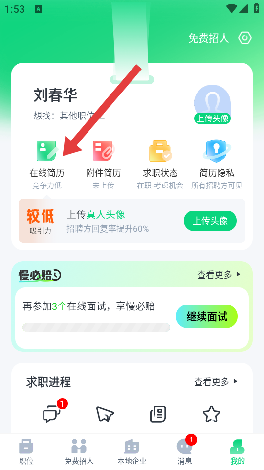 1、打開趕集直招APP,進入我的頁面,點擊在線簡歷的選項,進入我的在線簡歷頁面。