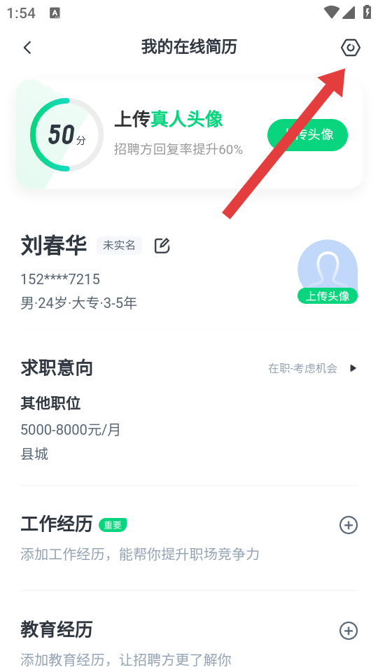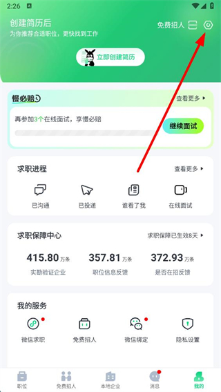 2、在我的在線簡歷頁面右上角,點擊設(shè)置的圖標,進入求職隱私保護的設(shè)置界面。