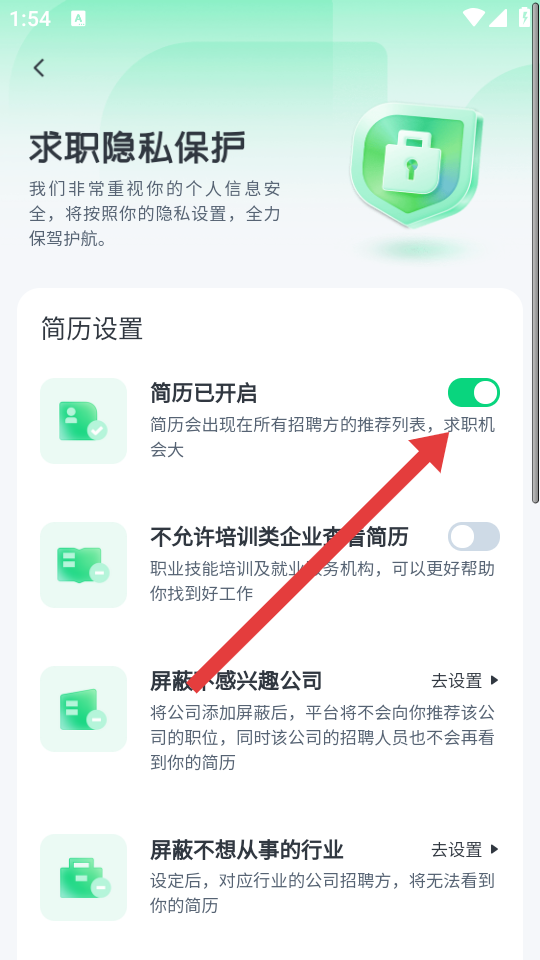 3、在簡歷設(shè)置板塊中,找到簡歷已開啟的選項,點擊右側(cè)開關(guān)按鈕將其關(guān)閉,即可關(guān)閉隱藏自己的簡歷。