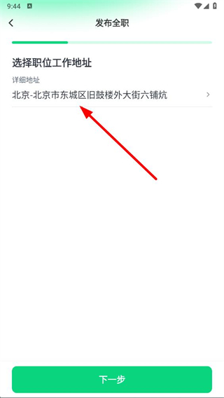 3、在發(fā)布全職頁面選擇職位工作地址,點擊下一步。