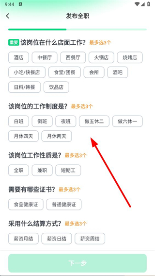 4、在發(fā)布全職頁面選擇崗位的店面、工作制度、等信息,按提示完成招聘信息發(fā)布。