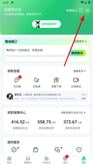 1、打開趕集招聘APP,在我的頁面點擊右上角設(shè)置圖標。