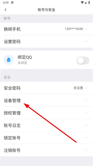 4、進入賬號與安全頁面后,點擊設(shè)備管理選項。