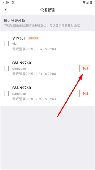 5、在設(shè)備管理頁面,找到想要下線的設(shè)備,點擊其右側(cè)的下線按鈕即可。