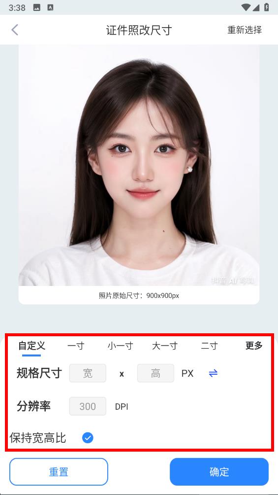 3、在證件照改尺寸頁面,下方有預設的尺寸選項,也可以選擇自定義,并設置規(guī)格尺寸、分辨率等參數(shù)。