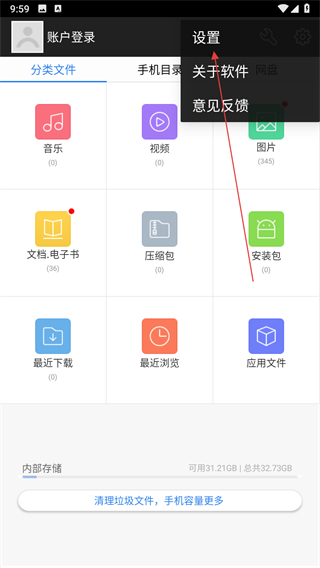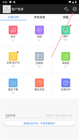 1、打開360超級文件管理器應(yīng)用,點擊頁面右上角的設(shè)置圖標。