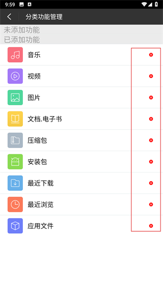4、進入頁面后,點擊對應(yīng)分類右側(cè)的叉號,即可移除該分類功能。