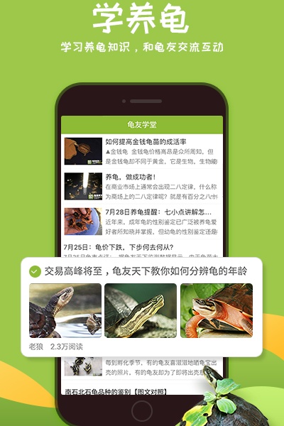 龜友天下網(wǎng)開發(fā)的手機應用;龜友天下口號——養(yǎng)龜賣龜看龜價,就上龜友天下!龜友天下服務于全國及全球龜友,為廣大石金錢龜、金錢龜、鱷魚龜友們提供便捷的龜鱉供求入口、龜鱉養(yǎng)殖技術(shù)交流論壇等。這里有觀賞、食用、藥用等世界各種類烏龜,更有廣大愛龜?shù)挠脩?,大家全國各地的龜友可以在此交流飼育心得,就觀賞、商業(yè)價值等進行交流討論,同時還能發(fā)布求助信息,咨詢一些相關(guān)的知識與經(jīng)驗,對日常生活是很有幫助的。