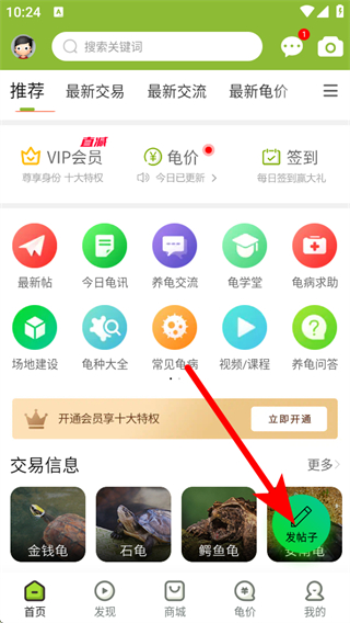 1、打開龜友天下應用,點擊首頁右下角的發(fā)帖子按鈕。