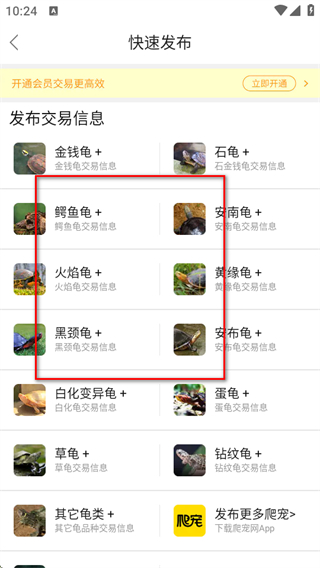 2、在快速發(fā)布頁面,選擇要發(fā)布的龜類,如鱷魚龜。