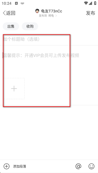 3、進入發(fā)布編輯頁面后,填寫標題、內(nèi)容并添加圖片等信息。