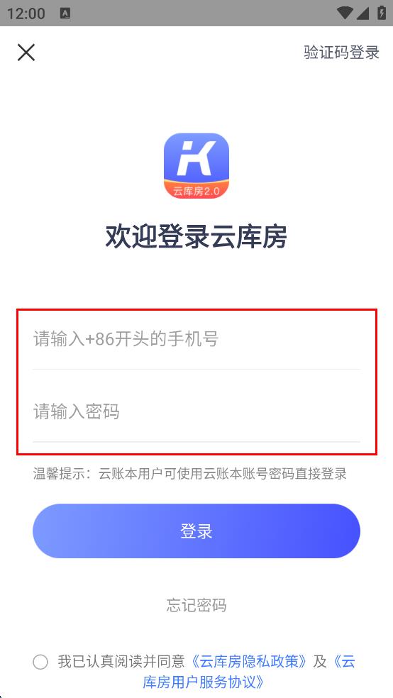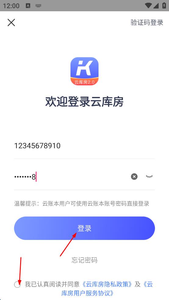 3、在登錄頁面,輸入手機號,接著請輸入密碼,然后勾選“我已認真閱讀并同意云庫房隱私政策及云庫房用戶服務協(xié)議。