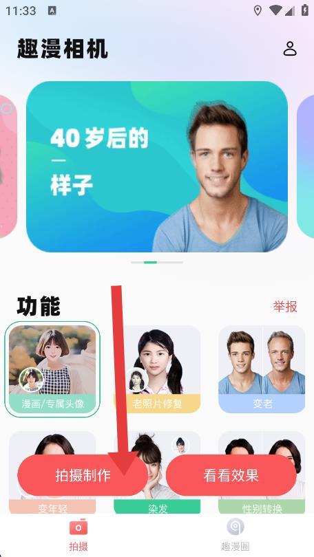 1、在首頁(yè)功能板塊中,點(diǎn)擊漫畫/專屬頭像下方的拍攝制作按鈕。