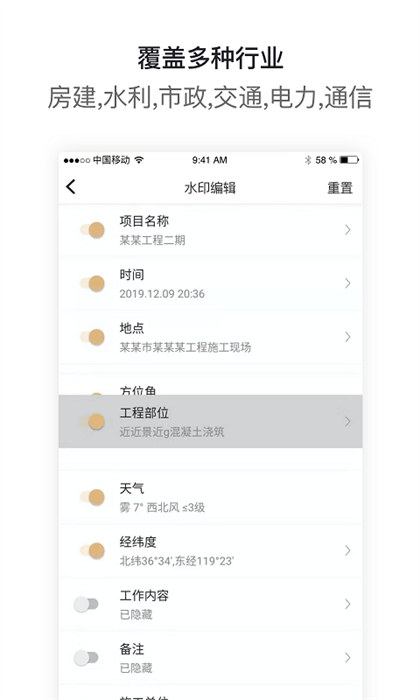 內(nèi)置工程項(xiàng)目名稱、工程部位、時(shí)間、地點(diǎn)、經(jīng)緯度、方位角、監(jiān)理單位、施工單位、監(jiān)測(cè)單位等一些列工程專用水印信息項(xiàng)目。