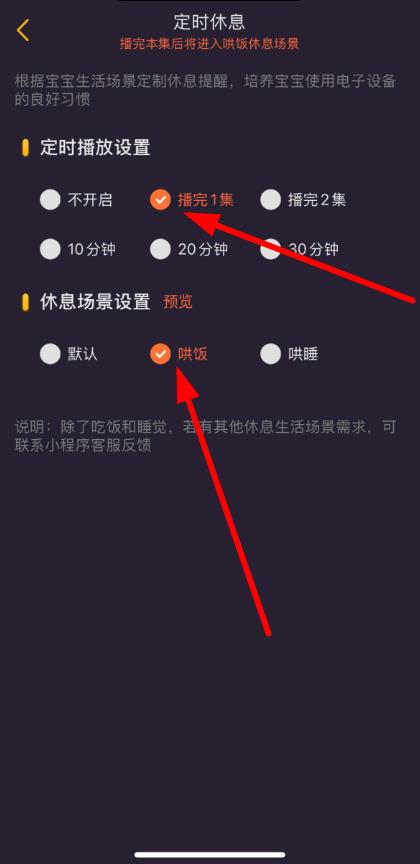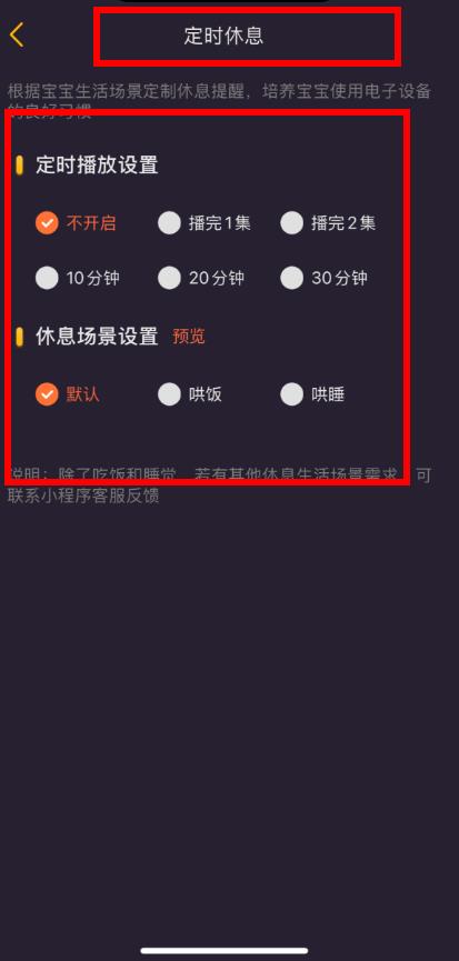 4、能進(jìn)行休息場(chǎng)景設(shè)置,可選擇默認(rèn)、哄飯、哄睡等不同場(chǎng)景,完成設(shè)置后即可按照設(shè)定執(zhí)行。