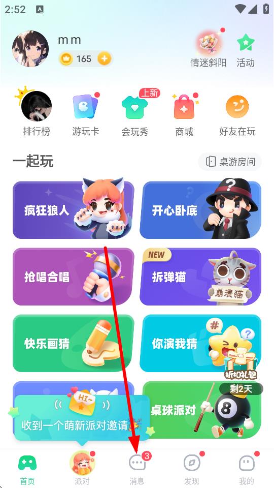 1、打開(kāi)會(huì)玩app,進(jìn)入主界面后點(diǎn)擊底部導(dǎo)航欄中的消息選項(xiàng)。