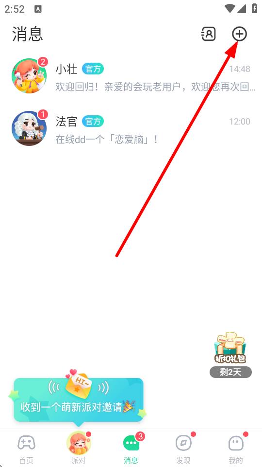 2、在消息頁(yè)面的右上角,點(diǎn)擊+號(hào)圖標(biāo)。