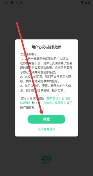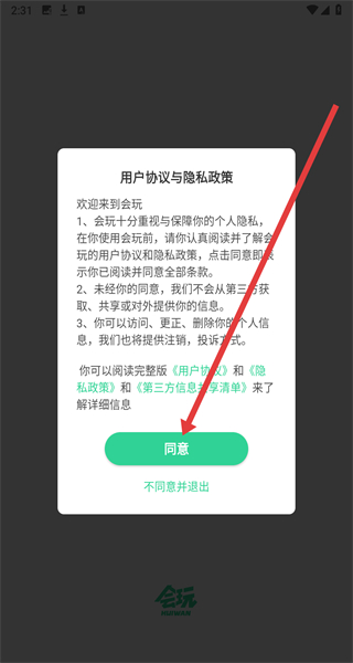 1、在打開(kāi)會(huì)玩app后,在彈出的彈窗中點(diǎn)擊同意按鈕,進(jìn)入使用。