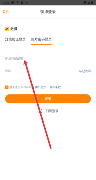4、在跳轉(zhuǎn)到微博登錄界面中,依次填寫手機(jī)號(hào)和密碼信息后,點(diǎn)擊登錄按鈕完成登錄。