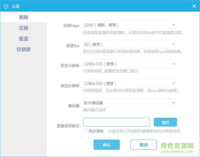 點(diǎn)擊"設(shè)置"按鈕可以調(diào)節(jié)視頻、音頻、推流與快捷鍵的設(shè)置