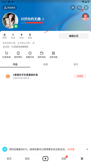 2、進入個人主頁內(nèi),點擊右上角三個橫線的功能圖標(biāo)。