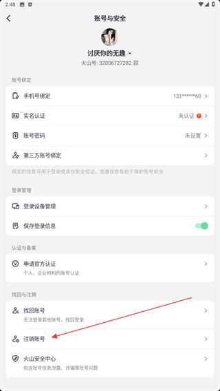 5、進入賬號與安全的界面內(nèi),點擊下方注銷賬號即可。