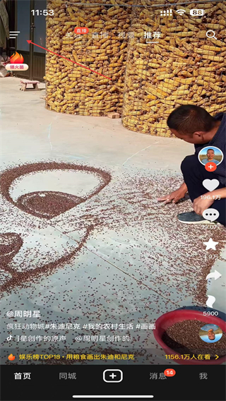 1、打開火山小視頻的APP,進入時點擊左上角的圖標(biāo)。
