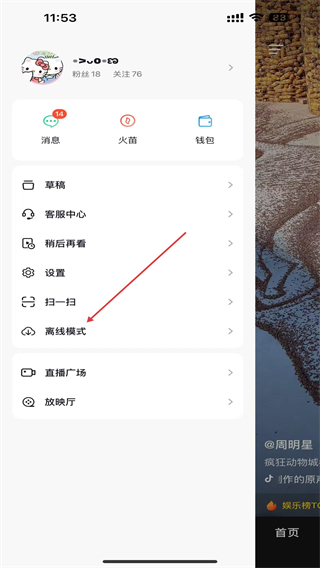2、在左側(cè)彈出的菜單欄中,點擊離線模式的按鈕。