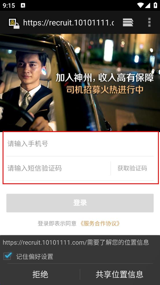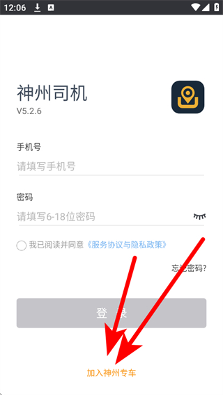 2、在登錄頁面,可選擇填寫手機(jī)號(hào)和密碼進(jìn)行登錄,也可點(diǎn)擊“加入神州專車”,進(jìn)入到加入方式選擇界面。