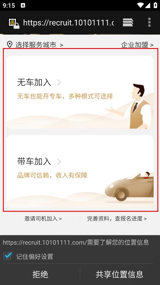 3、在加入方式選擇界面,有“無車加入”和“帶車加入”兩種選項(xiàng),根據(jù)自身情況選擇其中一種,進(jìn)入到相應(yīng)的信息填寫頁面。