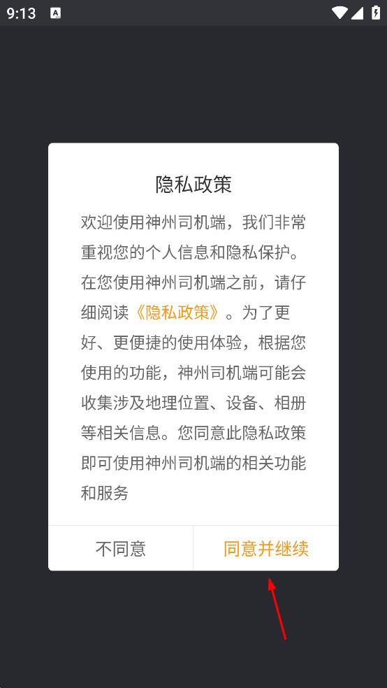 1、打開神州司機(jī)端應(yīng)用,會(huì)彈出隱私政策說明框,仔細(xì)閱讀后點(diǎn)擊“同意并繼續(xù)”,進(jìn)入到登錄頁面。