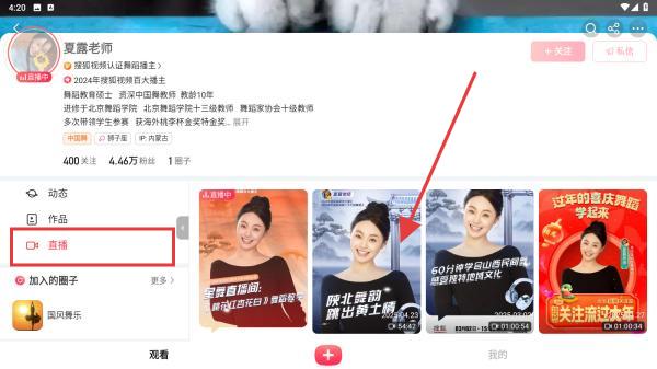 3、在個(gè)人的頻道內(nèi)找到直播的功能圖標(biāo),再點(diǎn)擊曾直播的內(nèi)容畫面即可看回放。