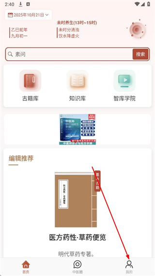 1、打開(kāi)中醫(yī)智庫(kù)APP,點(diǎn)擊我的選項(xiàng)。