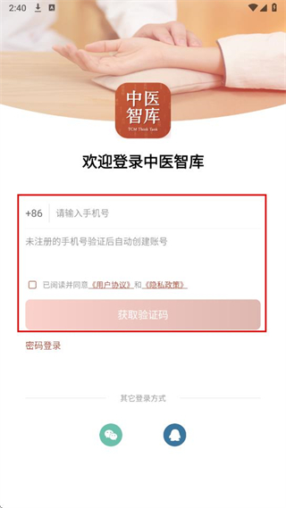 3、在登錄注冊(cè)頁(yè)面,輸入手機(jī)號(hào),勾選用戶(hù)協(xié)議和隱私政策。點(diǎn)擊獲取驗(yàn)證碼。