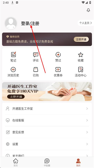 2、在我的頁(yè)面中,點(diǎn)擊登錄/注冊(cè)按鈕。