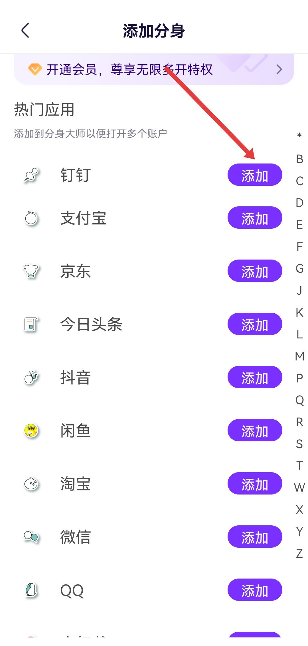 2、在添加分身頁面的熱門應(yīng)用列表中,找到要添加分身的應(yīng)用,點擊其右側(cè)的添加按鈕。