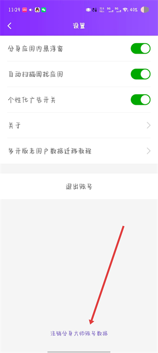 3、在設(shè)置頁面中,點擊注銷分身大師賬號數(shù)據(jù)選項,進(jìn)入申請注銷頁面。